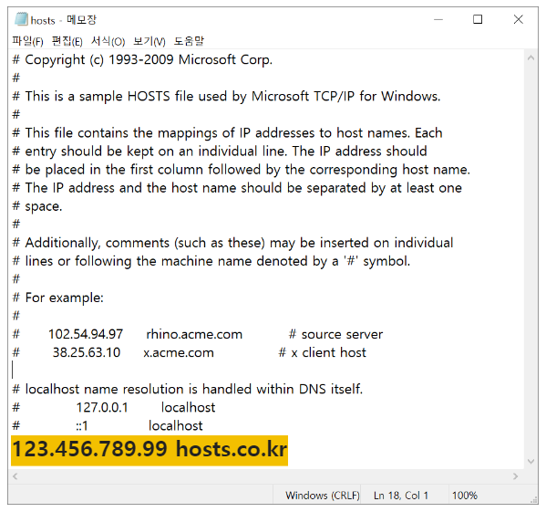 마지막 줄에 hosts 파일 작성 방법에 맞춰 # 없이 123.456.789.99 hosts.co.kr 이렇게 ip주소와 호스트명을 써주고 저장해줍니다.
