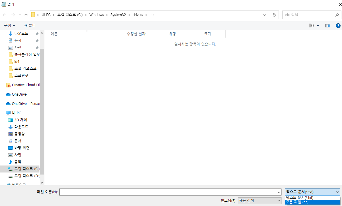 여기서 텍스트 문서로 되어있는 부분을 모든 파일로 변경해주면 hosts 파일이 나타납니다.